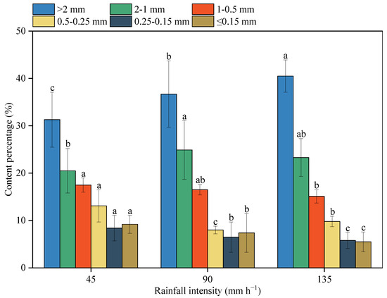 The sieved size and weight percentage of the eroded surface soil after rainfall simulation. The different letters indicate significant differences among different rainfall intensities (p < 0.05).