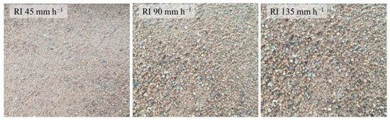 A 2 cm thick sediment layer on the surface was collected after rainfall ended for sieving analysis to determine the variations in PSD (Figure 8). The results showed that with an increase in rainfall intensity, the contents of large (>2 mm) and medium (1–2 mm) particles of the eroded sediment were increased. When the rainfall intensity was raised from 45 to 90 and 135 mm h−1, the content of particle with size (>1 mm) increased from 51.8% to 61.6% and 63.8%, respectively. Conversely, all particles with sizes (<1 mm) significantly decreased with the increase in rainfall intensity. The values were reduced from 48.2% to 38.4% and 36.2%, respectively.