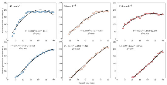 When the infiltration process is mainly controlled by soil conditions rather than rainfall intensity, it is a function of rainfall time. With the extension of rainfall time, subsurface flow and bottom penetration can be predicted by the one-dimensional quadratic polynomial of the rainfall time (Figure 10), and the relationship is expressed as follows:
