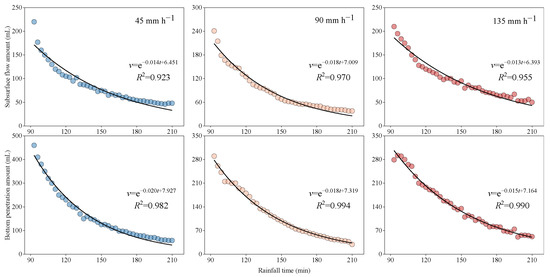 With an increase in rainfall intensity, the subsurface flow and bottom penetration fit better with rainfall time. The fitting relationship between bottom penetration and rainfall time (R2 > 0.98) is better than that of the subsurface flow (R2 > 0.92) (Figure 11).