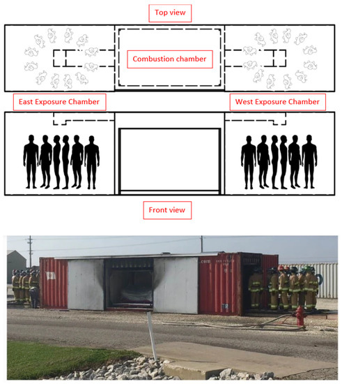 The FES and study design are described in detail elsewhere [17,29]. Briefly, mannequins were dressed in firefighting PPE and placed in the FES prop (Figure 1). The FES prop is a 2.4 m wide, 2.9 m tall, and 12.2 m long steel intermodal shipping container (85 m3), divided into three sections, where fire effluent from the 3.1 m long (center section) combustion chamber was ducted into the two 4.6 m long exposure chambers (east and west). The FES was designed to allow for reproducible fire conditions.