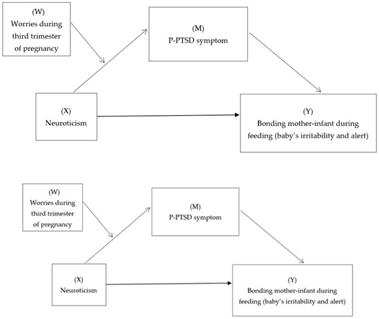 Despite the results reported by Matatyahu Tahar et al. [26], to our knowledge, no studies have yet been conducted associating neuroticism with infant attachment disorder during feeding, P-PTSD symptom, and the role that maternal worries about pregnancy may play during the gestational period. Worry is a key variable in all anxiety disorders and is defined by an endless chain of defeatist thoughts about difficult situations to be faced in the future. In pregnant women, these worries usually originate during gestation, and their content is related to childbirth or possible complications in the development of the fetus [27], so they usually maintain a positive relationship with neuroticism [27,28] and postpartum depression [29] according to previous research. Given the paucity of studies on postpartum PTSD symptoms in women at low obstetric risk, this study aimed to integrate neuroticism, as a risk personality variable, into a model that considers P-PTSD symptoms, and worries during pregnancy, as factors that may be related to infant attachment problems during feeding. Specifically, we propose that greater neuroticism is associated with greater infant bonding problems in feeding through the mediating effect of P-PTSD symptoms (Hypothesis 1). On the other hand, within the previous model proposed (neuroticism-P-PTSD symptoms-infant bonding in feeding), we hypothesize that worries during pregnancy could exert a moderating effect between neuroticism and P-PTSD symptoms (Hypothesis 2).