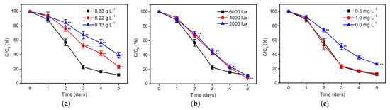 The residual ratio (C/C0) of total nitrogen in the culture solutions of S. platensis under different (a) initial inoculation amounts of 0.13–0.33 g/L (illumination intensity = 6000 lux, initial phosphorus level = 0.5 mg/L), (b) illumination intensities of 2000–6000 lux (initial inoculation amount = 0.33 g/L, initial phosphorus level = 0.5 mg/L), and (c) initial phosphorus levels of 0–1.0 mg/L (initial inoculation amount = 0.33 g/L, illumination intensity = 6000 lux) within 5 days cultivation. The statistically significant differences as compared to the optimized condition (initial inoculation amount = 0.33 g/L, illumination intensity = 6000 lux, and initial phosphorus level = 0.5 mg/L) were represented by * if p < 0.05 and ** if p < 0.01, respectively.