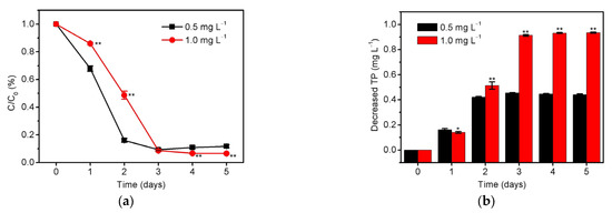 The (a) residual ratio (C/C0) and (b) decreased concentration of total phosphorus (initial phosphorus levels are 0.5 mg/L and 1.0 mg/L, respectively) in the culture medium of S. platensis within 5 days cultivation under initial inoculation amount of 0.33 g/L and illumination intensity of 6000 lux. The statistically significant differences as compared to the optimized condition (initial inoculation amount = 0.33 g/L, illumination intensity = 6000 lux, and initial phosphorus level = 0.5 mg/L) were represented by * if p < 0.05 and ** if p < 0.01, respectively.