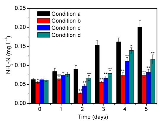 The contents of ammonia in the culture solutions of S. platensis within 5 days cultivation under the different conditions including (a) initial inoculation amount = 0.33 g/L, illumination intensity = 6000 lux, and initial phosphorus level = 0.5 mg/L; (b) initial inoculation amount = 0.13 g/L, illumination intensity = 6000 lux, and initial phosphorus level = 0.5 mg/L; (c) initial inoculation amount = 0.33 g/L, illumination intensity = 2000 lux, and initial phosphorus level = 0.5 mg/L; and (d) initial inoculation amount = 0.33 g/L, illumination intensity = 6000 lux, and initial phosphorus level = 0.0 mg/L. The statistically significant differences as compared to the optimized condition (condition a) were represented by * if p < 0.05 and ** if p < 0.01, respectively.