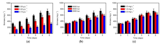 The removal of nutrients by S. platensis can not only improve the quality of reclaimed water but also is a necessary process to maintain the algal growth, which in turn further promotes its remediation ability as shown in Figure 1. Therefore, the biomass productivity of S. platensis was investigated under different conditions as displayed in Figure 4. It is shown in Figure 4a that the biomass increased to 0.32, 0.60, and 0.74 g/L by using the initial inoculation amounts of 0.13, 0.22, and 0.33 g/L S. platensis, respectively. The result demonstrated that higher inoculation amount could lead to more biomass accumulation (Figure 4a) and further improve the removal efficiency of total nitrogen (Figure 1a). However, the massive amount of biomass inevitably aggravated the situation of nutrient deficiency [23]. It thus has to recognize that S. platensis seems to be always starvation when applying for removing nitrate from the reclaimed water. As the photoautotrophic micro-organism, illumination intensity is an important factor for influencing the biomass growth of S. platensis, and thus was also studied, as can be seen in Figure 4b. It is found that the microalgal biomass under high illumination intensity (6000 lux) started to be significantly higher (p < 0.05) than those under low illumination intensity (4000/2000 lux) from the 3rd day. This is in line with the expectation that the photosynthetic activity and specific growth rate commonly increased with the increment of illumination intensity before reaching the light saturation point [35]. The effect of initial phosphorus level on the growth of S. platensis was further examined as displayed in Figure 4c. The absence of phosphorus obviously caused a significant reduction (p < 0.05) in biomass from the 4th day, which is later than that in nitrogen removal (from the 2nd day in Figure 1c). The result showed that phosphorus has little effect on the growth of microalgae, which is also supported by comparable biomass growth and nitrogen removal no matter if 0.5 or 1.0 mg/L phosphorus was used [43].