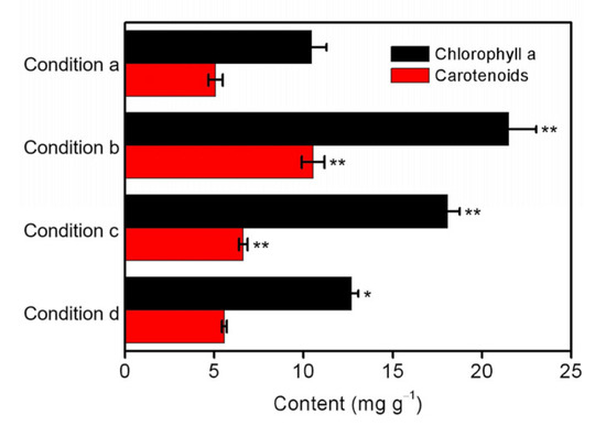 The contents of chlorophyll a and carotenoids in S. platensis after 5 days cultivation under the different conditions including (a) initial inoculation amount = 0.33 g/L, illumination intensity = 6000 lux, and initial phosphorus level = 0.5 mg/L; (b) initial inoculation amount = 0.13 g/L, illumination intensity = 6000 lux, and initial phosphorus level = 0.5 mg/L; (c) initial inoculation amount = 0.33 g/L, illumination intensity = 2000 lux, and initial phosphorus level = 0.5 mg/L; and (d) initial inoculation amount = 0.33 g/L, illumination intensity = 6000 lux, and initial phosphorus level = 0.0 mg/L. The statistically significant differences as compared to the optimized condition (condition a) were represented by * if p < 0.05 and ** if p < 0.01, respectively.