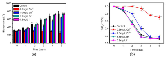 Effects of 0.5 mg/L Cu2+, 1.0 mg/L Zn2+, 1.1 mg/L Br-, and 0.2 mg/L I- on the (a) biomass growth and (b) residual ratio (C/C0) of total nitrogen for S. platensis within 5 days cultivation under the optimized condition. The statistically significant differences as compared to the control group were represented by * if p < 0.05 and ** if p < 0.01, respectively.