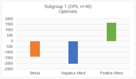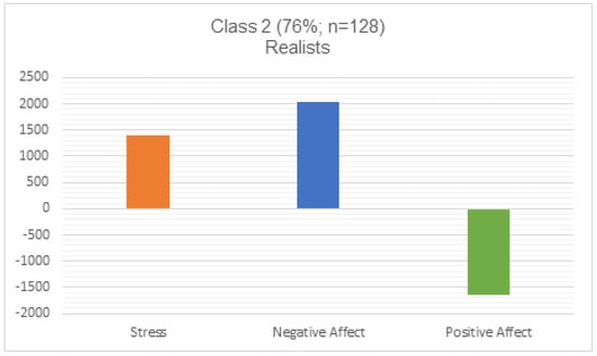 To examine the relationship between life satisfaction trajectories and other facets of well-being (stress, negative affect, and positive affect), we conducted a post hoc multinomial linear regression analysis. Our analysis reflected that, compared to Class 2 (realists), individuals in Class 1 (optimists) experienced lower stress, lower negative affect, and higher positive affect during the first wave of the pandemic. Individuals in the realist class reported lower positive affect but higher stress and negative affect (see Figure 2 and Figure 3).