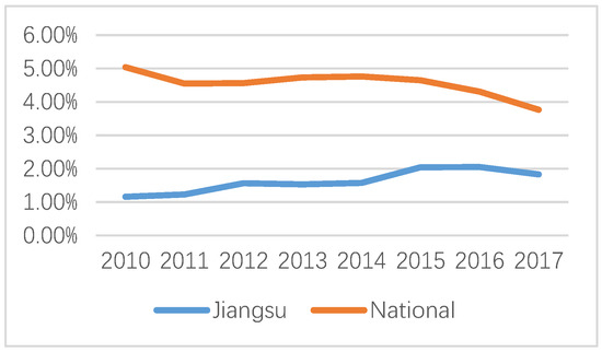 As shown in Figure 3, national energy industry investment as a share of GDP showed a slow downward trend. The main reason for this was the decreasing dependence of the steadily climbing economic growth rate on the still increasing, but more moderately, energy demand. However, from a regional point of view, the share of energy industry investment in GDP in Jiangsu province rose slowly and then showed a downward trend. With rapid economic development, the industrial-based economy is gradually transforming into a service-based economy. Furthermore, technological progress and environmental awareness have driven an energy-saving transformation of energy. Various industries and residential life use electricity more widely, and energy use is more efficient. Hence, taking Jiangsu as a sample for analyzing the energy infrastructure issue, on one hand, it can serve as an effective contrast to the situation in developed countries. On the other hand, the presentation of the situation relating to the development of energy infrastructure in the best provinces of the Chinese economy can also serve as a benchmark for comparison with the development of other regions of China and other developing countries globally.