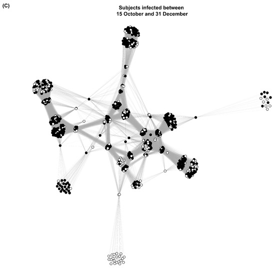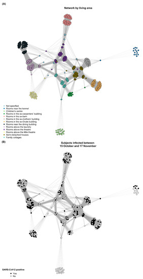 Figure 2 depicts the progression of virus transmission within the community. The network is represented in three phases of the outbreak: before the first case was detected, the day when the highest number of daily infections was reached, and after the last case was observed. The virus spread widely among strongly linked subjects (e.g., those with rooms above the laundry and rooms in the ex-Ovale building), whereas it was contained or did not circulate in more isolated clusters (e.g., the children’s center and family cottages). The network graph contained 42,556 weighted edges, leading to an average degree of 52.73 and a network density of 0.13.