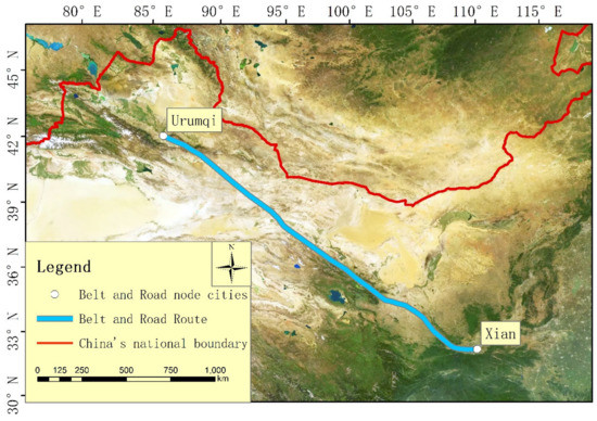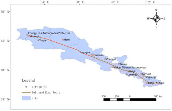 This paper takes the “Silk Road Economic Belt” from Xi’an to Urumqi in the Chinese Mainland, which is located in northwest China. As seen in Figure 1, the study area is located at 85°17′ E~109°49′ E, 33°42′ N~45° N, with an area of about 604,518.13 km2. It passes through five provinces or autonomous regions, including Shaanxi Province, Gansu Province, Ningxia Province, Qinghai Province, and Xinjiang Uygur Autonomous Region. There are 16 cities or prefectures, i.e., Xi’an City, Xianyang City, Baoji City, Pingliang City, Guyuan City, Lanzhou City, Baiyin City, Wuwei City, Zhangye City, Jiayuguan City, Jiuquan City, Haibei Tibetan Autonomous Prefecture, Urumqi City, Turpan City, Hami City, and Changji Hui Autonomous Prefecture, which can be seen in Figure 2.