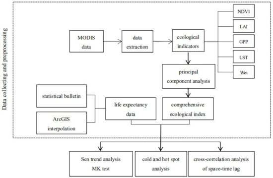 Life expectancy (LE) is an important indicator to measure the health level of national, ethnic, and regional residents. Compared with child mortality, maternal mortality, and other indicators, LE can better reflect the mortality of the population regarding overall age [18]. The ecological environment is one of the important factors affecting LE [19]. Gulis et al. used LE as an evaluation index to measure the health of the ecological environment [20]. At present, research on the relationship between LE and the ecological environment tends to focus on the impact of various environmental factors on LE. For example, Nkalu et al. used the GARCH model to study the impact of the environment on LE in Africa [21]. Wang et al. found that economic growth and a reduction in air pollution can promote the growth of LE [19]; Wu et al. used the linear mixed effects model to analyze PM2.5 and LE and found that a decrease in PM2.5 was related to an increase in LE, and the strict implementation of the Action Plan for Air Pollution Prevention and Control had significant benefits for LE [22]; however, because the LE in each period is the average of the past LE, the LE index is lagging behind. Some scholars try to study the time lag and spatial lag effects of environmental factors on LE. In terms of a time lag, Cheng et al. used the distributed nonlinear lag model to fit the time relationship between air pollution and LE [23]; Muhammad Haroon Shah et al. used the nonlinear autoregressive distribution lag model to reveal the long-term relationship among environmental quality, public environmental expenditure, and LE [24]; In terms of spatial lag, Ladoy et al. found that neighborhood characteristics have an impact on the spatial lag of LE in a study area [25]. However, at present, studies on the combination of time lag, spatial lag, and LE have not been reported.