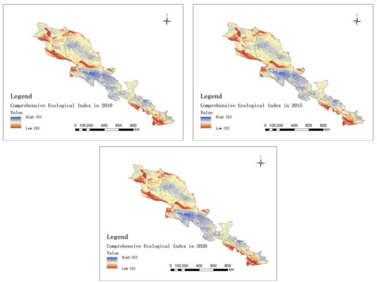 The five indicators (NDVI, LAI, GPP, LST, and Wet) of the study area in 2010, 2015, and 2020 were obtained, respectively. Then, the PCA (Table 1) was carried out, and the distribution results of the CEIs in 2010, 2015, and 2020 are shown in Figure 4.