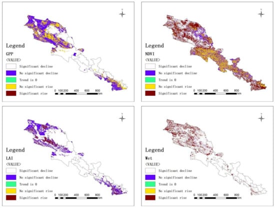 Table 2 shows the number of pixels, observations, mean, standard deviations, minimums, and maximums of GPP, LAI, LST, NDVI, and WET. The number of pixels is the total number of pixels in 16 county areas for each indicator; NDVI is observed once every 16 days, and GPP, LAI, LST, and WET are observed once every 8 days, so the number of observations in a year is 23 or 46, and the product of the total number of observed counties was the total number of observations, i.e., 46 × 16 = 736, and 23 × 16 = 368; the mean, standard deviation, maximum, and minimum are the total values of each indicator in 16 counties per year. (Note: GPP, LAI, LST, and NDVI are abbreviations for gross primary production, leaf area index, land surface temperature, and normalized difference vegetation index, respectively).