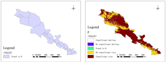 The Mann–Kendall test method is a nonparametric test method. Compared with other parametric test methods, this method does not require samples to follow a certain distribution. Besides, it is less interfered with by outliers and is more suitable for sequential variables. The specific formula is as follows, where S is the statistic and Z is the test statistic. When Z is positive, it indicates that the data tend to increase with time. When Z is negative, it indicates that the data tend to decrease with time. A value of Z = 0 indicates that the data have no tendency to increase or decrease.