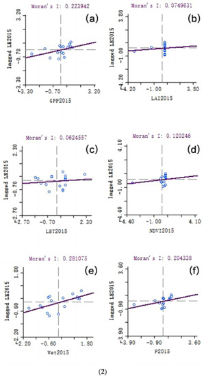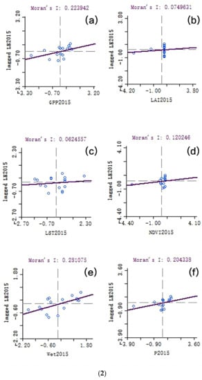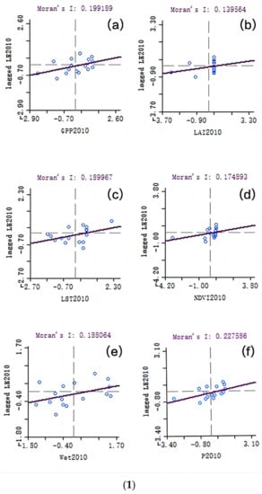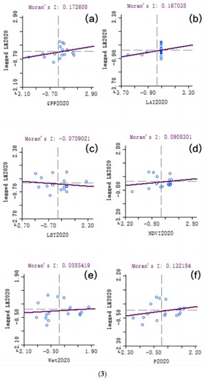 The results of the Moran scatter diagram in Figure 7 show the results of the spatiotemporal lag spatial crosscorrelation analysis between the LE data and the various index data. The Moran’s I for GPP in 2010 and LE in 2015 is about 0.280, which is the highest, indicating that the spatiotemporal lag correlation between GPP and LE is the highest. It is inconsistent with the correlation coefficient results. When only considering the time lag, the Pearson coefficient for LAI is about 0.590, which is the highest; the Moran’s I of LAI in 2015 and LE in 2020 is about 0.124, which is the highest, followed by a Moran’s I for GPP in 2015 and LE in 2020, which is about 0.118. The Moran’s I for LST in 2015 and LE in 2020 is negative, which is about −0.071. This indicates that LAI and LE have the highest spatiotemporal lag correlation. In the lag correlation analysis (without considering spatial distribution), the Pearson coefficient for GPP is about 0.567, which is the highest, and the Moran’s I is inconsistent with the correlation coefficient; The Moran’s I for GPP in 2010 and LE in 2020 is about 0.218, which is the highest, indicating that the spatiotemporal lag correlation between GPP and LE is the highest. It is consistent with the correlation coefficient results. In the correlation analysis that only considers time lag, the Pearson coefficient for GPP is about 0.545, which is the highest. In conclusion, the spatiotemporal lag correlation between GPP and LE is higher than other ecological indicators.