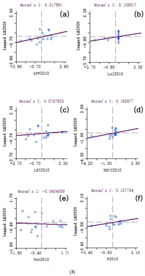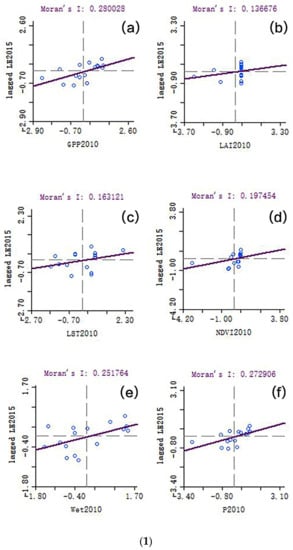 Without considering the spatial distribution, the correlation between the annual index data and LE (Table 4) and the time lag correlation (Table 5) were calculated. It can be seen from the table that most of the index data are positively correlated with LE. The correlation between annual LST and the corresponding LE is small or negative; LST and NDVI in 2020 are negatively correlated with LE in 2020. Through spatiotemporal lag analysis, it was found that LST and Wet in 2010 and 2015 are negatively correlated with LE in 2015 and 2020, respectively.
