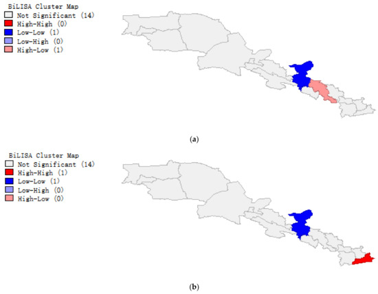 The partial results of the Cluster Map obtained by GeoDa are shown in Figure 8. It can be seen that the LE in 2015 and the CEI in 2010 in the Cluster Map are low-low in Wuwei City, high-low in Baiyin City, and not significant in other cities; LE in 2020 and CEI in 2010, and LE in 2020 and CEI in 2015 in the Cluster Map show low-low in Wuwei City and high-high in Xi’an City.