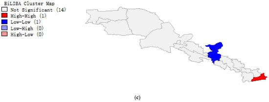 Cluster Map results. (a) Cluster Map of life expectancy (LE) in 2015 and comprehensive ecological index (CEI) in 2010. The figure shows low-low in Wuwei City, high-low in Baiyin City, and is not significant for the other cities. (b) Cluster Map of LE in 2020 and CEI in 2010. The figure shows low-low in Wuwei City and high-high in Xi’an City, and is not significant in the other cities. (c) Cluster Map of LE in 2020 and CEI in 2015. The figure shows low-low in Wuwei City and high-high in Xi’an City, and is not significant in the other cities.