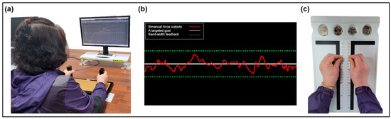 While generating and maintaining isometric forces around a submaximal targeted level using visual information, quantifying the properties of constant force outputs, as referred to the force control capabilities, can be a useful approach for estimating altered bimanual motor performances via visuomotor processing in older women [9,10,11]. Bimanual force control capabilities can be estimated by calculating the accuracy (e.g., root mean square error; RMSE), variability (e.g., coefficient of variation; CV), and regularity (e.g., sample entropy; SampEn) of the total forces produced by two hands [12,13,14]. In particular, SampEn, a temporal structure of variability in non-linear time series force signals, represents motor adaptability (i.e., continuous visuomotor corrections) contributing to successful motor actions. Thus, a higher value of SampEn indicates relatively changeable force control patterns, indicating a greater motor adaptability related to improvements in the bimanual force control capabilities [15,16]. Previous studies reported age-related changes in bimanual force control as indicated by a greater task error, variability, and regularity in older adult groups compared with young controls [11,17]. Furthermore, Lodha and colleagues suggested that a deterioration in bimanual force control performances (e.g., less bimanual force coordination and more asymmetric force production between two hands) for chronic stroke patients was associated with motor impairments in the upper extremity (e.g., lower scores in the Fugl–Meyer assessment and PPT assembly performances) [18,19]. These findings informed that determining altered bimanual force control capabilities in older women may suggest potential changes in bimanual kinetic performances related to sensorimotor processing functions. Although bimanual kinetic and kinematic motor functions at submaximal levels are crucial because the successful activities of daily living are mainly achieved by submaximal motor actions [20,21,22], no one has determined how bimanual submaximal motor functions change in older women [9,11,17,23].