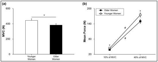 To confirm potential differences in the bimanual muscle strength between the two groups, we conducted independent t-tests on the bimanual MVC values. The analyses indicated that the values of bimanual MVC were significantly lower in the older women group compared with the younger women group (t42 = −2.059 and p = 0.046; Figure 2a). Furthermore, a two-way mixed ANOVA on the mean force showed a significant Group × Force Level Condition (2 × 2) interaction [F (1, 42) = 4.707; p = 0.036; partial η2 = 0.101; Figure 2b]. The post hoc analysis revealed that the mean force during the submaximal bimanual force generation in the older women group was significantly lower across all the targeted force levels (p = 0.039 at 10% of MVC and p = 0.037 at 40% of MVC) than the younger women group, and further the mean force significantly decreased from 40% to 10% of the MVC for both groups (p < 0.001; Figure 2b). These findings indicate that while bimanually executing isometric contractions, the older women showed less muscle strength as well as less submaximal force generation around the targeted force lines than those in the younger women.
