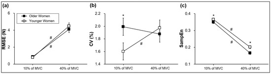 The analysis on the CV showed a significant Group × Force Level Condition (2 × 2) interaction [F (1, 42) = 6.136; p = 0.017; partial η2 = 0.127; Figure 3b]. The follow-up tests revealed that the older women group produced a higher CV than the younger women group at 10% of MVC (p = 0.048), whereas no significant difference in the CV between the groups appeared at 40% of MVC (p = 0.597). The younger women group significantly reduced the CV from 40% to 10% of MVC (p = 0.011), whereas this change was not observed in the older women group (p = 0.407). These findings demonstrate that the older women produced more force variability in comparison to the younger women at the lower targeted force level, and they failed to decrease the force variability from a higher to lower submaximal force level.
