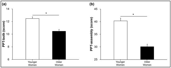 The independent t-tests showed that the number of components successfully inserted into the holes for the older women group was significantly less than those in the younger women group across two PPT task conditions: (a) both hands condition (t42 = −5.101 and p < 0.001; Figure 4a) and (b) assembly condition (t42 = −6.928 and p < 0.001; Figure 4b). These findings indicate that older women showed significant aging-induced changes in the bimanual motor dexterity compared to the younger women.