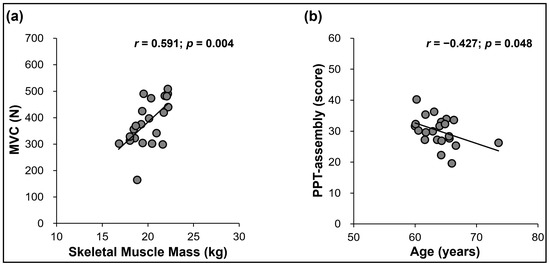 The primary analyses identified significant differences between the groups for age, the body composition variables (i.e., skeletal muscle mass, body fat mass, and BMI), and the bimanual kinetic and kinematic variables (i.e., MVC, mean force, SampEn, CV, and PPT scores in both hands and assembly task conditions). Thus, we conducted correlation analyses between the age, body composition, and bimanual motor function variables for the older women group (Table 2). The analyses revealed that lower levels of skeletal muscle mass were significantly related to lower bimanual MVC levels (Figure 5a). In addition, a higher age was significantly related to lower bimanual PPT assembly scores (Figure 5b).