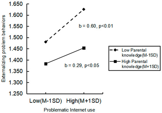 This study also confirmed the third hypothesis (H3), that is, parental knowledge plays a role by showing a moderating effect on the relationship between problematic Internet use and adolescent externalizing problem behaviors. According to educational ecosystem theory [47], adolescents with high levels of positive family characteristics, such as parental knowledge, are less likely to engage in problem behaviors in high-risk environments (e.g., problematic Internet use). The possible explanation is for families with high levels of parental knowledge, adolescents grow up in a more harmonious and warmer home where parents are likely to provide them with good guidance and therefore exhibit lower levels of problem behaviors [44,84]. This implies that when parents are less knowledgeable about their children’s activities and friendships, problematic Internet use can take a serious toll and eventually lead to higher levels of problem behaviors.