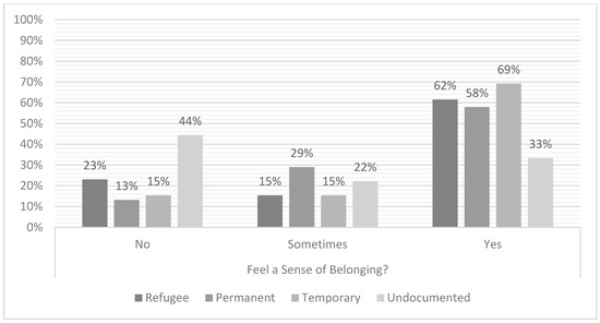 Among the 73 participants whose interviews were included in this analysis, 14 interviewees (19% of the sample) expressed feeling that they do not belong; 17 interviewees (23%) expressed feeling like they sometimes belong; and 42 interviewees (58%) expressed feeling that they belong in the United States and/or Utah. Migrants with permanent, undocumented, refugee, and temporary status were represented in each of the categories of belonging. (See Table 2 and Figure 1; for additional demographic information by sense of belonging, see Appendix A.)