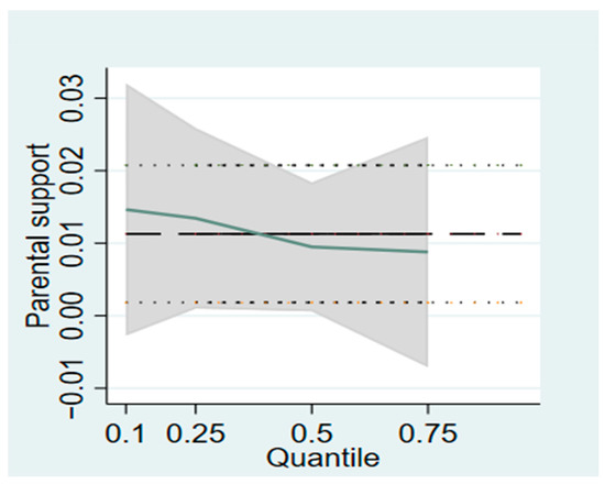 It can be found from Figure 1 that, on the whole, the effect of parental support on physical activity energy consumption of college students is lower in high quantiles than their peer support. Parental support has no significant effect on college students’ physical activity energy consumption at the 0.10 and 0.75 quantile points. There are significant positive effects at the 0.25 and 0.50 quantile points. Specifically, at the 0.25 and 0.50 points, the energy consumption of physical activity of college students will increase by 1.007 (exp (0.007) = 1.007) and 1.005 (exp (0.005) = 1.005) for each unit increase of parental support.