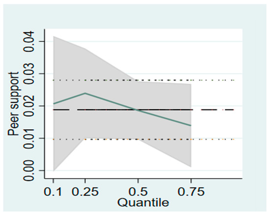 It can be seen in Figure 2 that peer support has a significant positive impact on college students’ physical activity energy consumption at all quantiles, showing an “inverted U-shaped” curve shape. Specifically, below the 0.10, 0.25, 0.50, and 0.75 quantiles, the energy consumption of physical activity of college students increases by 1.010 (exp (0.01) = 1.010), 1.012, 1.009, and 1.007, respectively, for each unit increase of peer support.