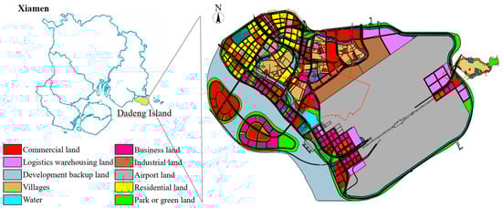 Dadeng Island in Xiamen, located on the southeast coast of China, was selected as the study area. It has a total area of 41.61 km2, with a population of 90,000, including 68,000 residents and 22,000 villagers. Figure 1 presents the location and land use type of Dadeng Island. A reservoir of flood-regulating lakes is around the island, with a total water area of 1.18 km2.