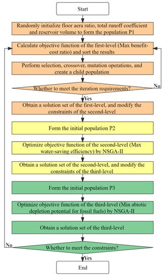 As the key to the promotion of CB-RWU, the economic benefit was considered as the most significant among the three types of objective functions in this paper. Without promotion, there would be no water resources and environmental benefits []. Furthermore, for CB-RWU, ensuring local water resources benefits and alleviating water shortages were considered more urgent than reducing the global environmental impacts obtained through LCA []. Therefore, the priority goal of this optimization model was to maximize the BCR, followed by the improvement of the WSE and the minimization of the ADPF. The NSGA-II and the lexicographic method were adopted to meet these goals (Figure 3). The implementation process follows these pseudocodes: