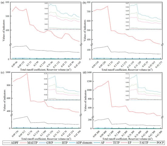 Life cycle assessment results of community-based rainwater utilization when the floor area ratio was: (a) 1; (b) 1.7; (c) 2.4; (d) 3.1. (EP: eutrophication potential; FAETP: freshwater aquatic ecotoxicity potential; POCP: photochemical ozone creation potential; ADP elements: abiotic depletion potential elements; AP: acidification potential; TETP: terrestrial ecotoxicity potential: global warming potential; HTP: human toxicity potential; ADPF: abiotic depletion potential for fossil fuels; MAETP: marine aquatic ecotoxicity potential).