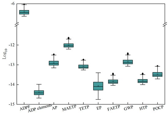 Table S3 and Figure 4 present the results of the 10 indicators across all life cycle stages for every scenario. The marine aquatic ecotoxicity potential (MAETP) was observed to have the largest environmental impact. This is related to the concentration of heavy metals discharged into water, which are typically produced in the process of electricity production and coal mine waste treatments in landfills. The second-ranked indicator was the ADPF, which is attributed to the large consumption of fossil energy (e.g., coal, oil and natural gas) during raw material production, material transportation, on-site construction and end disposal. Moreover, according to the Chinese power grid database in GaBi and the National Bureau of Statistics of China, the current power structure in China is still dominated by hard coal power generation, while clean energy only accounts for about 25% of the total power generation. High levels of electricity consumption occurred at all stages of the whole life cycle []. This was particularly true during the operation and maintenance stage, where continuous power was required to maintain the operation of water pumps and ensure normal water usage. Therefore, the large use of electricity was also an important reason for the high ADPF.