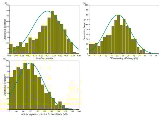Simulated values histogram of: (a) benefit–cost ratio; (b) water-saving efficiency; (c) abiotic depletion potential for fossil fuels.