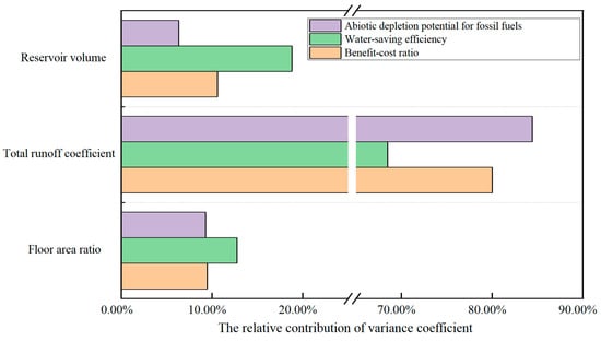 In order to analyze the contribution of each parameter to the uncertainty of every objective function, the Monte Carlo simulation was performed on the random sampling of the FAR, total runoff coefficient and reservoir volume. This approach is distinct to the overall uncertainty analysis above (Table 7). The CV of the BCR was consistently lower than the other two objective functions, indicating that it exhibited the lowest uncertainty from changes in the three parameters. The changes in the FAR and reservoir volume had a minimal impact on the uncertainty of the WSE and environmental impact, while changes in the total runoff coefficient had a far greater impact on the environmental benefits compared to the water resource benefits. Quantitative analysis of the uncertainty sources was then conducted (Figure 7). The uncertainty of the three objective functions mainly originated from changes in the total runoff coefficient, with a relative contribution rate of 80.0%, 68.5% and 84.4% for BCR, WSE and ADPF, respectively. Changes in the FAR and total runoff coefficient had the greatest impact on the uncertainty of environmental impact, while changes in the reservoir volume had the greatest impact on the WSE.