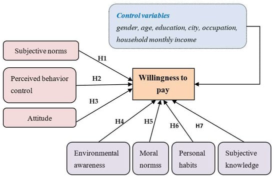 In contrast to previous studies, environmental awareness, moral norms, subjective knowledge, and personal habits have not been discussed together, although some researchers have studied WTP in conjunction with other theoretical models. Therefore, this study proposes to introduce an integrated model (as shown in Figure 1) to study the WTP of Chinese residents for adopting a green lifestyle. Thus, a research model of consumers’ willingness to pay for carbon-neutral products is constructed to evaluate the relationship between attitude, perceived behavior control, subjective norms, moral norms, personal habits, subjective knowledge, environmental awareness, and WTP. The assumptions are as follows: