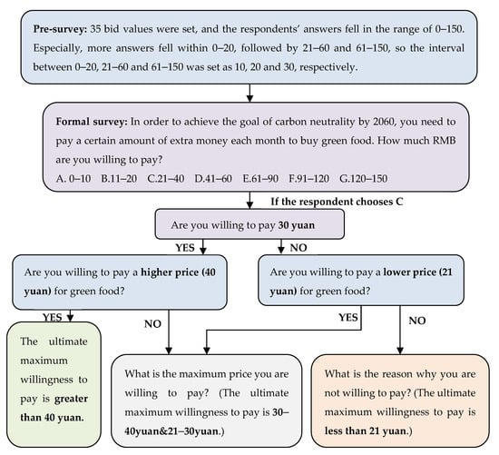 The second part was a five-level Likert scale measuring psychological variables such as attitude, perceived behavior control, subjective attitude, subjective norms, environmental awareness, personal habits, moral norms, and subjective knowledge. The answers were based on a five-point scale ranging from “strongly disagree” to “strongly agree.” The third part was, based on DBDC from five aspects of green food, clothing, travel, housing, and waste recycling, to calculate the monthly plan for a carbon-neutral personal budget. Respondents were first presented with the initial bid level for each green lifestyle. The process of the investigator selecting the bid is shown in Figure 2. If the answer was yes, asked about the higher value of the bid; if the answer was no, the lower value of the bid was asked.