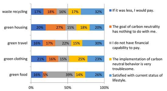Some psychological and demographic variables found in this study that could predict residents’ WTP for a green lifestyle were supported by some literature studies. For example, in terms of green food, the research of Cooper et al. [88] showed that almost two-thirds of Australian shoppers were willing to pay higher prices for health-starred products. Huang et al. [18] found that Taiwanese consumer respondents were willing to pay an additional $21.95 per year for organic CAS milk. As to green clothing, Jacobs et al. [89], based on a large number of samples of German female consumers, investigated the possible contributing factors and the influence of barriers to sustainable clothing purchasing behavior and spotted that a positive attitude of altruistic value could promote the purchase of sustainable clothing. As regards green housing, Zalejska-Jonsson [90] studied Swedish residents’ WTP for green buildings, and the results revealed that people were willing to pay more for low-energy buildings. There were many literature studies showing that [31,91] travel and waste recycling were indeed the difficulties and obstacles of deep carbon emission reduction for residents, and people were quite critical of carbon-neutral products in these two fields.