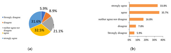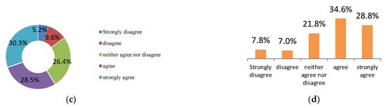 Seven variables, including attitude, perceived behavior control, subjective norms, environmental awareness, subjective knowledge, moral norms, and personal habits, were set in the questionnaire to study the respondents’ attitudes and behavior toward carbon neutrality, as shown in Figure 4. Among them, the variables of attitude, perceived behavior control, and subjective norms were calculated from the values of two items in the questionnaire. The seven psychological variables were classified according to “strongly disagree, disagree, neither agree nor disagree, agree and strongly agree.” Seeing that the variables of attitude, perceived behavior control, and subjective norms were obtained by averaging the answers of the two sub-questions, it could be concluded that the mean value of subjective norm, perceived behavior control, and attitude was 3.75, 3.84, and 3.69, respectively. This indicated that the respondents’ attitudes towards feeling much social pressure, the ease of implementing a green lifestyle, and taking part in environmental action were all between “neither agree nor disagree” and “agree.”