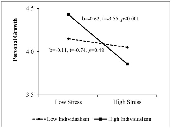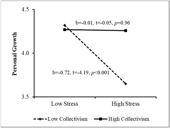The PROCESS procedure [49] was then used to examine the sources of the interactions. The results appear in Figure 1, Figure 2, Figure 3 and Figure 4. As Figure 1 indicates, when perceived stigma was high, the association between stress and personal growth was negative and stronger than that when perceived stigma was low. In other words, among women who sensed greater stigmatization because of their need for fertility treatment, greater stress was associated with lower growth. This effect was much weaker among women reporting low perceived stigma. In addition, when coping flexibility was low, the relationship between stress and personal growth was negative, but it was insignificant when coping flexibility was high (Figure 2). That is, among women displaying lower coping flexibility, greater stress was related to lower personal growth. However, no relationship was found between stress and growth among women demonstrating higher coping flexibility. Figure 3 shows that among women reporting higher levels of individualism, the association between stress and personal growth was negative, while this association was insignificant among women reporting low individualism. Finally, when the level of collectivism was low, a negative relationship was found between stress and personal growth, and it was insignificant among women reporting high collectivism (see Figure 4). That is, only among women reporting a lower level of collectivism, the greater the stress, the lower the level of growth (Research Question 4). In step 5, the moderation effect of ethnicity was not found to be significant.