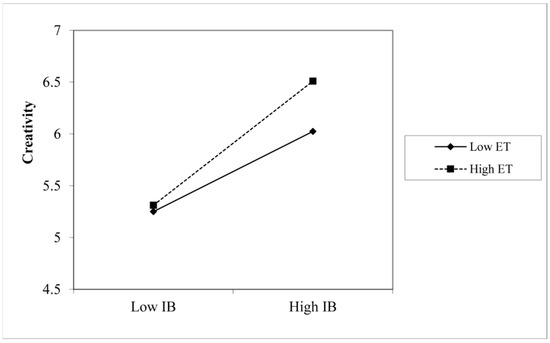 This study used the hierarchical regression method to test the moderating effect of environmental turbulence. To eliminate the influence of collinearity, this paper centralized the two variables when constructing the product term of the independent variable and moderating variable, and the results are shown in Table 6. According to the models Model2 and Model3, the interaction between the interactive budget and environmental turbulence has a significant positive impact on enterprise innovation performance (β = 0.223, p < 0.001). The main reason for the positive direction of H4 could be the sample characteristic. We distributed questionnaires in the Yangtze River Delta region, where “the three provinces and one city in the Yangtze River Delta” are all in the top 10 in China in terms of innovation capability level. The interviewees are CEOs, CFOs, finance managers, and department managers from companies in the Yangtze River Delta region who have experience in finance, have decision-making power, and have more experience in budgeting. Therefore, as mature managers, during times of environmental turbulence, they may be less likely to retreat from interactive budget efforts and more likely to take a proactive approach. To show the moderating effect of environmental turbulence more intuitively, we conducted a simple slope analysis, as shown in Figure 2. It can be seen from the figure that when the degree of environmental turbulence is high, the use of the interactive budget model has a more significant positive impact on enterprise innovation performance; when the degree of environmental turbulence is low, the relationship between the interactive budget and enterprise innovation performance is not significant. This was in line with our expectations. Therefore, H4 is supported.