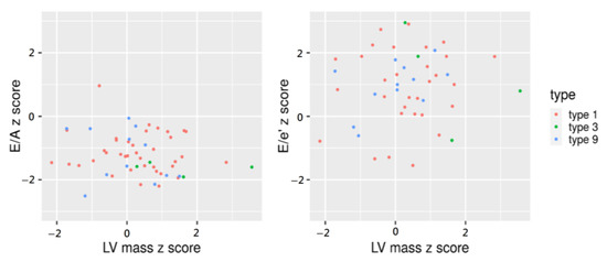 The comparison of BMI and echocardiographic parameters adjusted for the age, height, and weight of pediatric patients is listed in Table 2. The median BMI z-score was 1.2 (range, −2.5–2.24), and there was no difference in the BMI z-score according to GSD type. However, of the five patients with BMI z-scores >2, 2, 2, and 1 had GSD types I, III, and IX, respectively. The mean LV mass indexed z-score was 0.3 (range, −1.05–3.56). When comparing myocardial thickness between GSD types, the LV mass z-score (p =0.037), interventricular septum diameter (IVSd) z-score (p < 0.001), and LV posterior wall thickness diameter (LVPWd) z-score (p < 0.001) were relatively high in the patients with GSD type III. In this study, most of the pediatric patients had normal LV mass z-scores, except for two patients (GSD types I and III) with an LV mass z-score >2. One patient with a normal LV mass z-score had an IVSD z-score of >2 and had GSD type I. Analysis of diastolic and systolic function showed no significant differences between the GSD types. Four patients had an E/A z-score less than −2 and 15 had an E/e’ z-score greater than 2 (Figure 1). However, there were no pediatric patients with both E/A and E/e’ outside the −2–2 range or reversal of E/A (ratio <1). The RV s’, indicating RV function were all within the normal range, as evaluated by z-score. All values of EF and FS remained within normal ranges. There were no patients with decreased LV myocardial strain as evaluated by z-score, and there was no difference between GSD types. Similar to the results in Table 1, there was a difference in laboratory findings between groups.