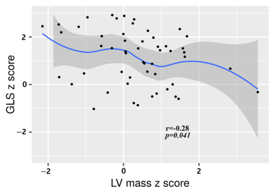 Correlation between global longitudinal strain (GLS) z-score and left ventricle mass z-score.