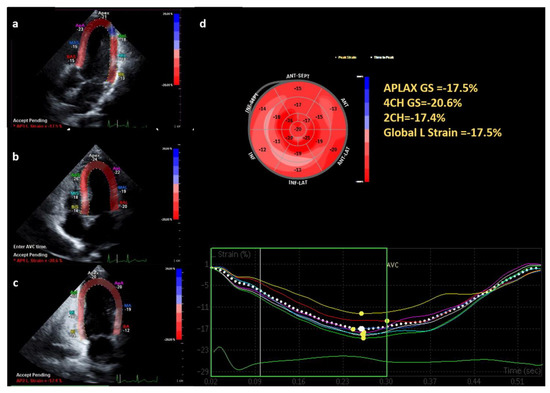 Left ventricular GLS assessment with two-dimensional speckle tracking echocardiography. The figure demonstrates analysis of left ventricular GLS from the three-chamber (a), four-chamber (4CH) (b) and two-chamber (2CH) (c) views. (d) Polar map with the regional values and the GLS value calculated from the 17 segments which is within the normal value.
