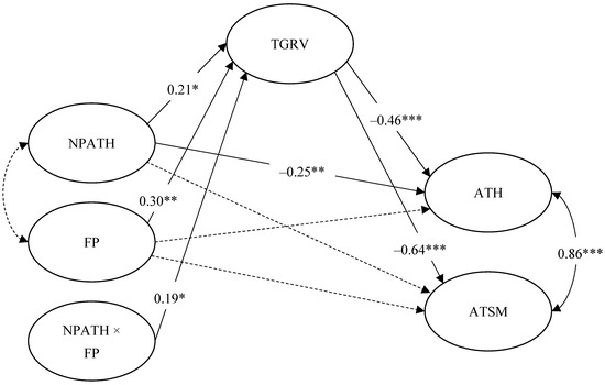 Final moderated mediation model. Solid lines represent significant paths. Dashed lines represent non-significant paths. Significant standardized coefficients are presented. Control variables (gender, age, and sexual orientation), observed indicators and error variances are omitted for clarity. NPATH = negative parental attitudes toward homosexuality; FP = filial piety; TGRV = traditional gender role values; ATH = attitudes toward homosexuality; ATSM = attitudes toward same-sex marriage. * p < 0.05. ** p < 0.01. *** p < 0.001.
