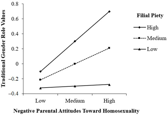 This study found that negative parental attitudes toward homosexuality were associated with greater endorsement of traditional gender role values. This finding echoes the previous research findings that more homophobic parents have a greater endorsement of traditional sex roles [25], and negative attitudes toward gays and lesbians are related to more traditional gender role beliefs in child rearing [26]. Furthermore, this study revealed that filial piety significantly enhanced the association between negative parental attitudes toward homosexuality and traditional gender role values. Negative parental attitudes toward homosexuality were associated with traditional gender role values only for those with high or medium levels of filial piety, but not for those with a low level of filial piety. This finding is in accordance with the notion that more filial children may be more willing to internalize values socialized by their parents [32]. Nonetheless, filial piety did not significantly moderate the direct effects of negative parental attitudes toward homosexuality on attitudes toward homosexuality and same-sex marriage. It may be because the effects of negative parental attitudes toward homosexuality were mediated by traditional gender role values.